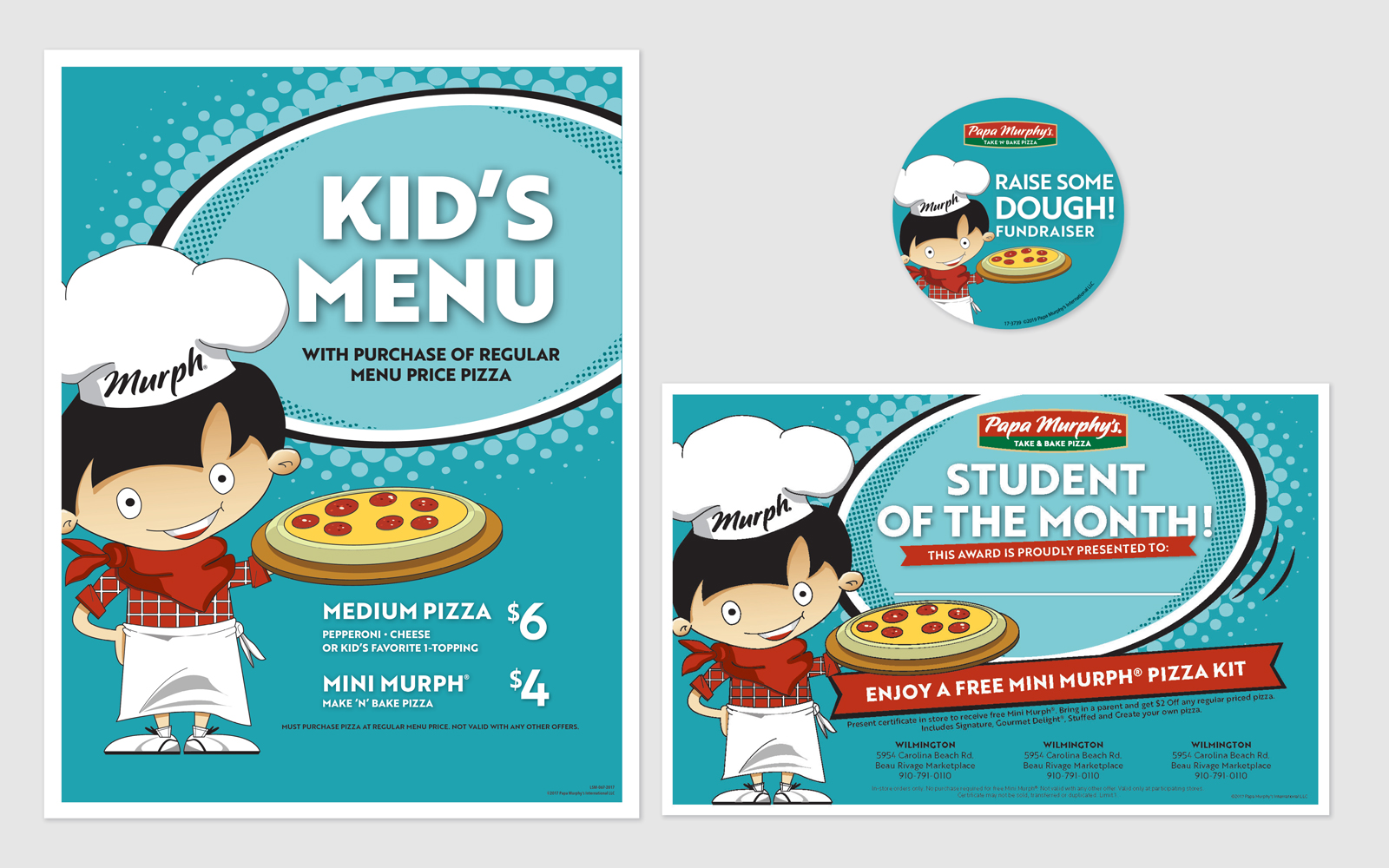 We also worked closely with the creative director at Papa Murphy’s through a brand evolution. The materials went from bright pops of color to what we would describe as clean and timeless. The design exploration lead to a more elevated brand style with a focus on food appeal. Stunning photography on white backgrounds consistently showcased the quality of Papa Murphy’s pizzas. The close up shots of warm cheese coming off the pizza slice had customers across the U.S. ready to grab a Papa Murphy’s pie. We are proud to have put our creative touch on a variety of materials and be part of this successful brand shift for Papa Murphy’s.